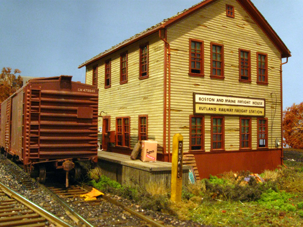 | The Osborn Model Kits derail installed on the freight house siding at Bellows Falls, Vermont. A post comes with each derail. |