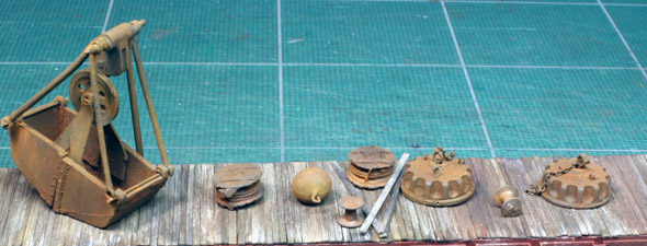 | A group of my metal details and figures have just received a coat of Floquil SP lettering gray. I normally use Floquil Grime for this job. I did not realise I had ran out until just before spraying. |